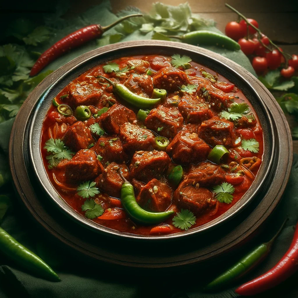 Um prato de carne (geralmente de cabrito ou vaca) cozinhada com batatas num molho rico e espesso de tomate e especiarias.